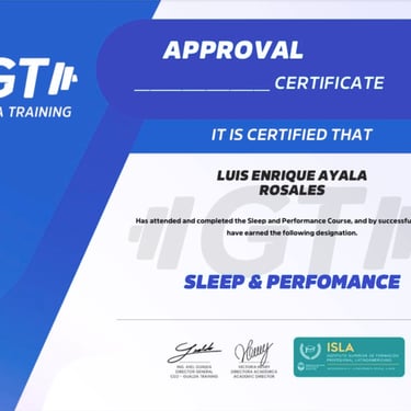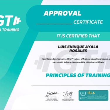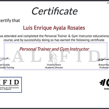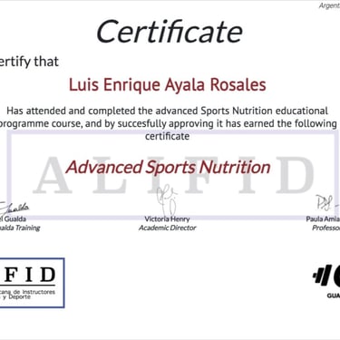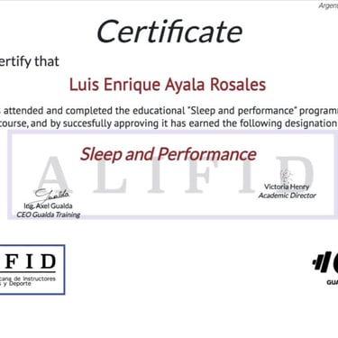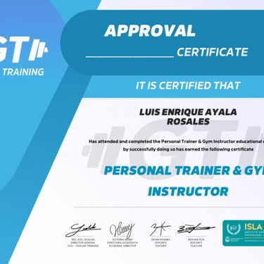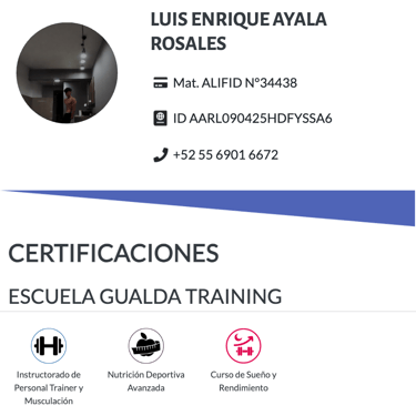 Cuento con instructurado/certificaciones con aval internacional en Personal Trainer y Musculación, Nutrición Deportiva Avanzada, Sueño y Rendimiento Deportivo, y en los principios del entrenamiento y la nutrición deportiva, respaldadas por ALIFID y ISLA.